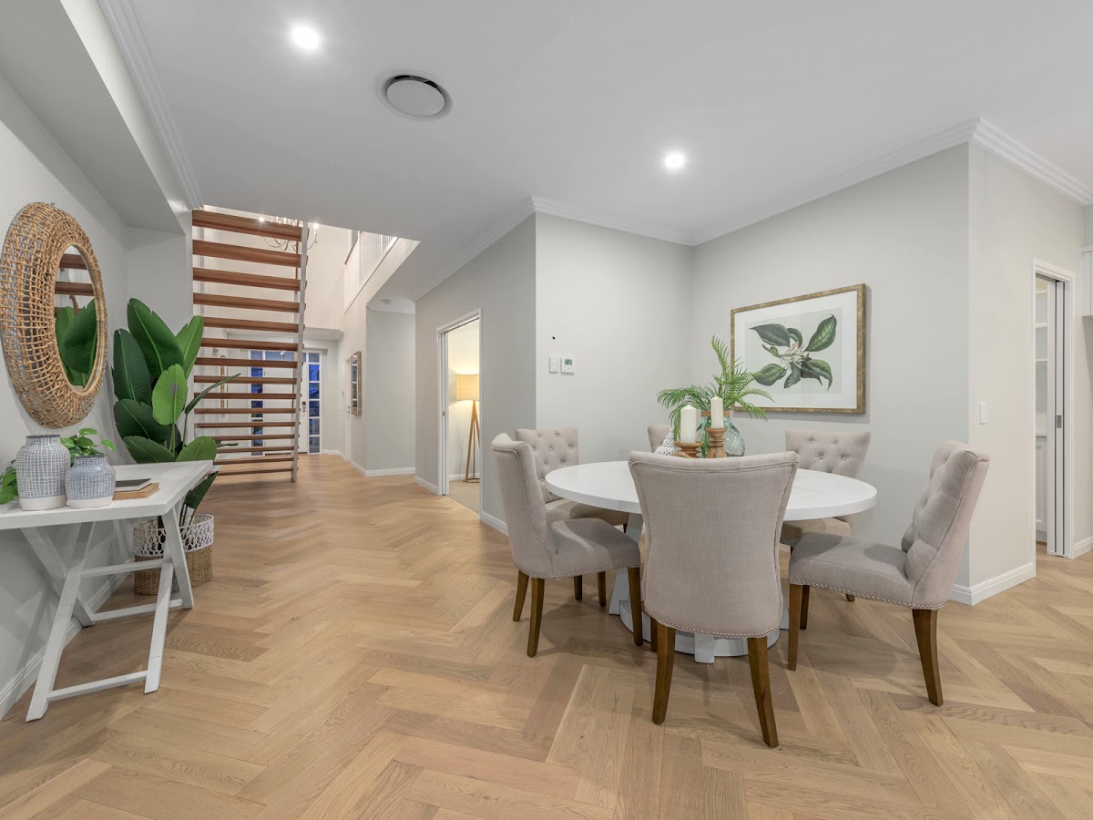 Stepping through the front door, the grand entryway instantly draws you inside with its soaring void, herringbone timber flooring and sparkling chandelier, creating an incredible sense of space.