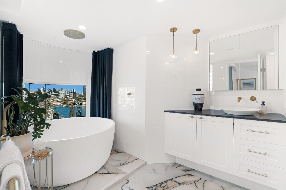 -Ensuite has a gorgeous large freestanding bath, an over spa rain shower and incredible views! Stunning Spanish Porcelain tiles that look and feel like marble without the upkeep. Stone Benchtops adorned by gorgeous brass taps, and brass fittings throughout. White Shaker Style cabinetry and overhead mirrored shaver cabinets provide ample storage. Feature lighting provides a beautiful ambience. Full length sheer linen curtains give you that extra privacy. Quality new toilet.
