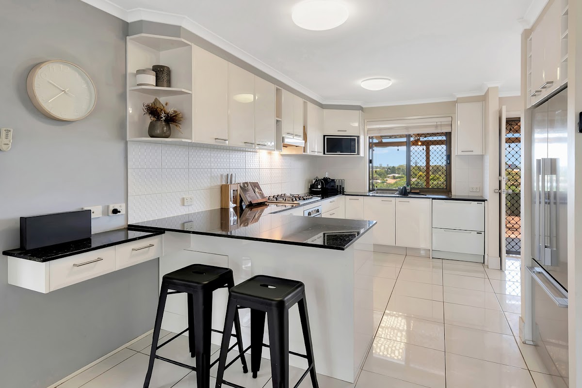 Tiled throughout, open plan, and a kitchen that captures the amazing views, it’s designed for easy living. The kitchen is sleek and contemporary with 2-pack finishes, granite benchtops, and a gas cooktop. There are three bedrooms which all have built-in robes, plus there’s an optional fourth that could be utilised as a bedroom, office, or additional living space. The living area and master bedroom are air-conditioned and ceiling fans feature throughout the home.