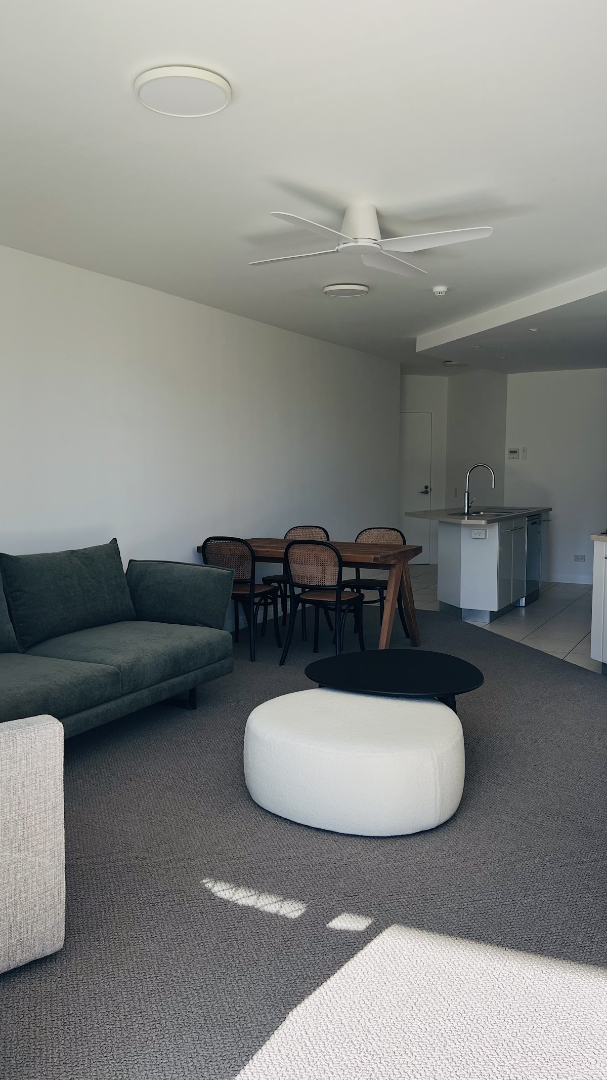 The open plan layout creates a seamless flow between the living, dining, and kitchen areas, perfect for entertaining guests or simply relaxing with friends. The modern kitchen is equipped with top-of-the-line appliances, including a dishwasher, making meal preparation a breeze.