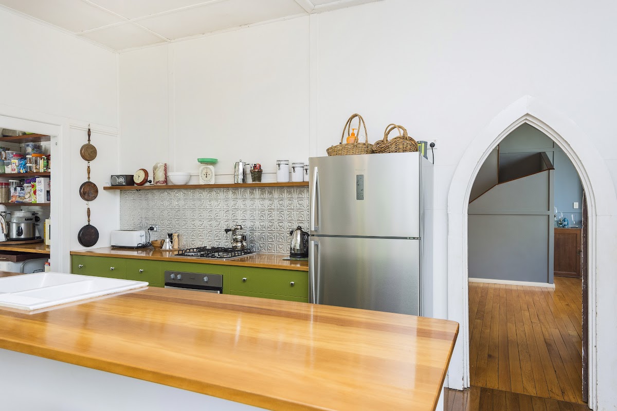 The open plan galley style kitchen is well-equipped complete with Garo Garo benchtops pressed tin splashback and a convenient pantry with loads of cupboard space.