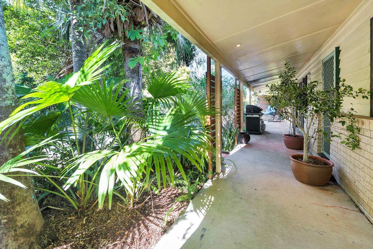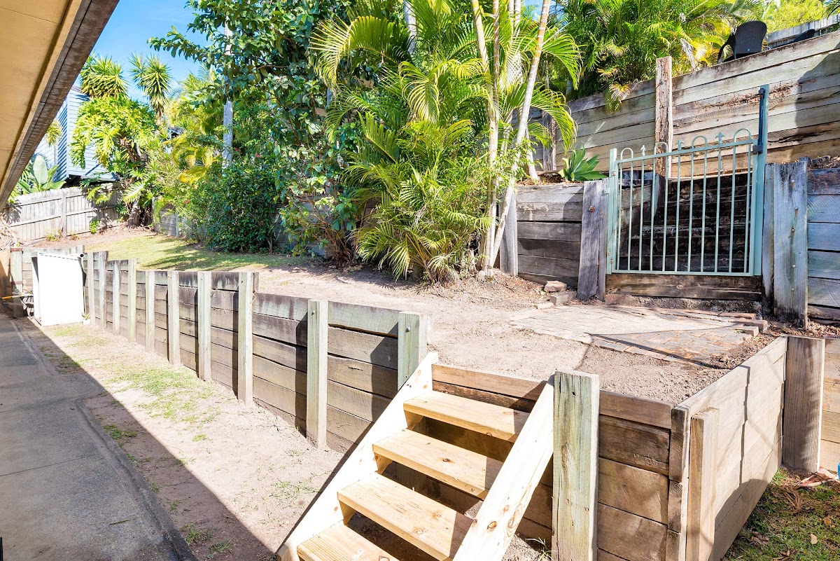 The front of the block is level offering easy access. The back yard has been terraced to utilise the slope creating a series of tiers, the top one marked for entertaining. It’s tropical landscaping, paved undercover area and plunge pool makes it perfect for cooling off on hot summer days – and without all the work of a regular pool.