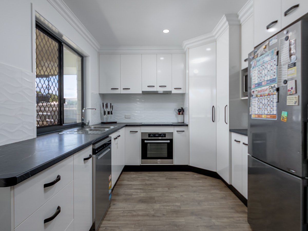 The kitchen cupboards are white two-pak with black bench tops and handles. Stainless steel appliances, dishwasher, oven, cooktop exhaust fan. Microwave cavity with has a perfect bench underneath for a coffee station.