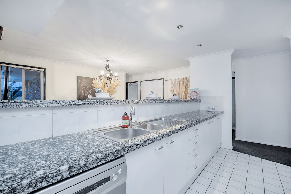 * Stone bench tops in kitchen