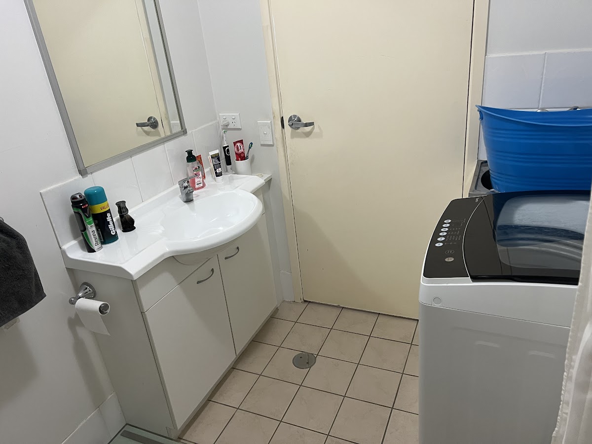 6. The combined bathroom and laundry is positioned off the bedroom – with a large open shower, vanity and toilet