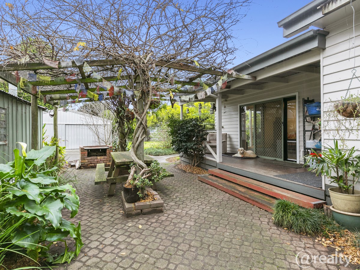 The comfortable lounge ensures an immediate sense of ease is experienced, featuring an open fireplace and split system air conditioning evoking an impression of homeliness and seasonal comfort. The bright and spacious sunken family area affords rest and relaxation, providing bench seating with storage and a split system air conditioning unit. From here, a glass sliding door leads out to a covered rear deck, cascading down to a paved entertaining area boasting a pergola—generously sized for family enjoyment.