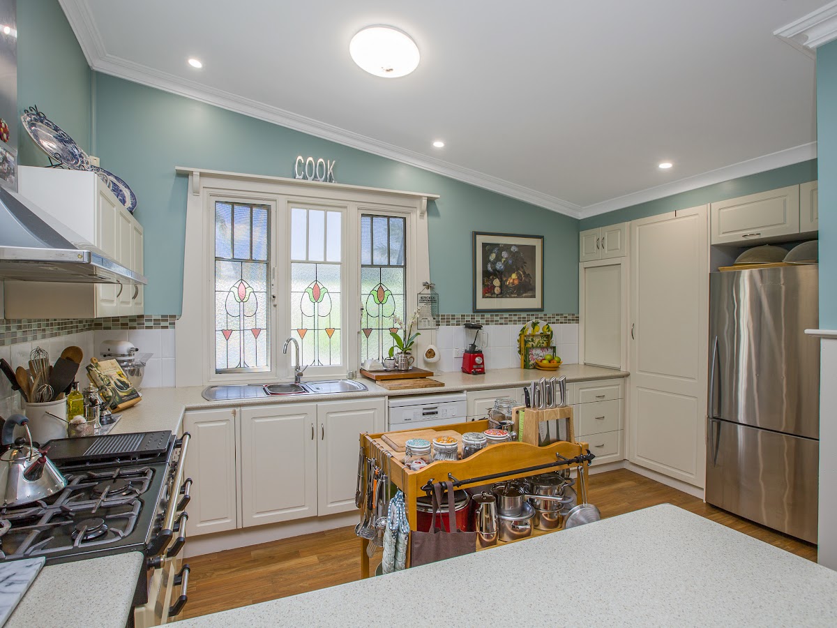 Moving through to the kitchen and meals area, the lead light feature windows allow a flood of natural morning light in, with pantry, plumbed fridge recess and excellent bench space and top of the line oven and cook top.