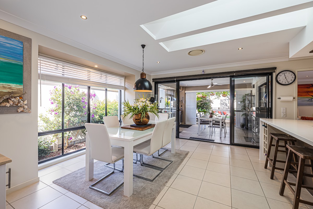 The kitchen is light and airy with Caesar stone waterfall bench tops, built-in 3-way microwave oven, dishwasher drawer, instant boiling water tap, undermount sink, plumbed refrigerator space, walk-in pantry and lots of cupboard space. Velux double glazed gas filled skylights with remote controlled solar powered block-out blinds provide lots of light and adds a bespoke feature to the open plan living area. The master bedroom is graced with double sinks to the en-suite, walk-in robe and reverse cycle air-conditioning.
