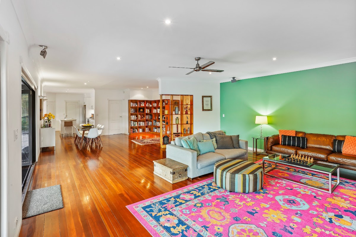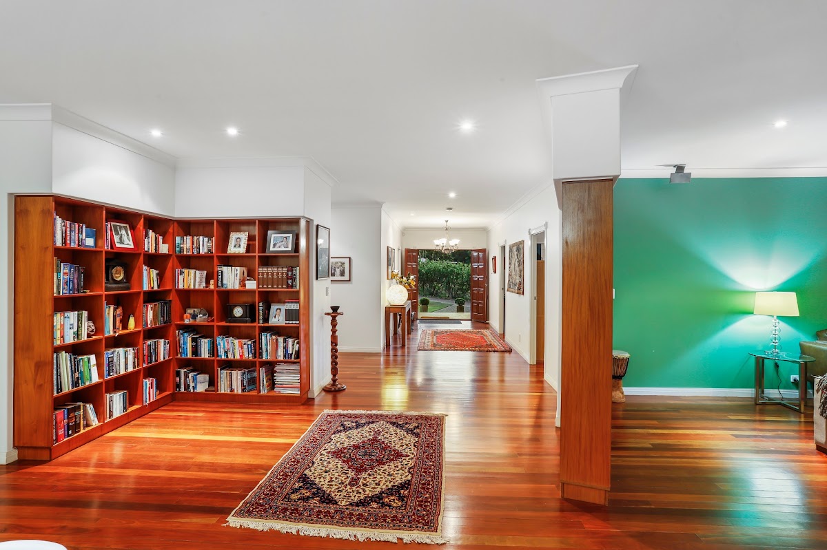 * A combination of custom timber book shelving and solid timber floors .