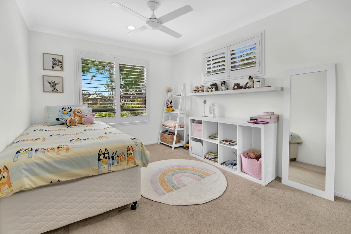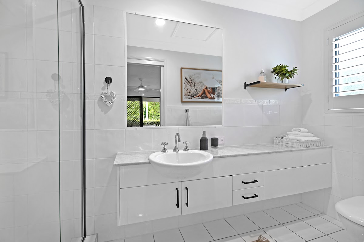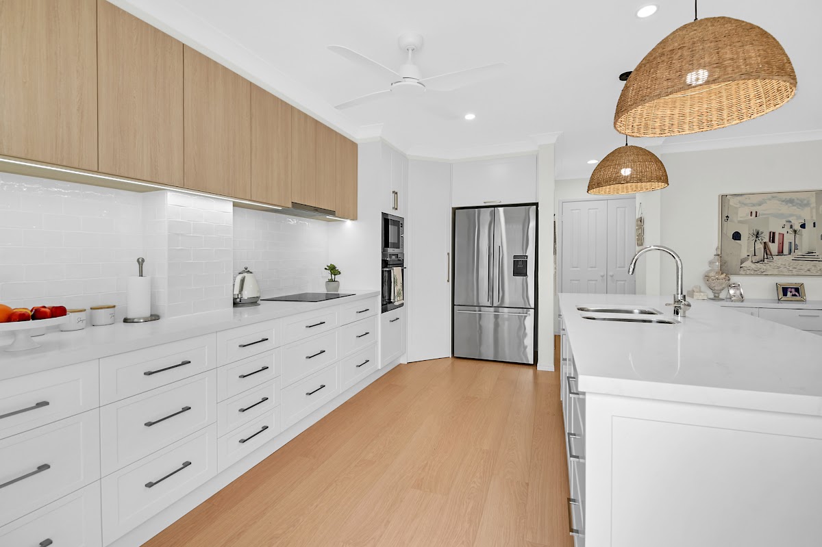 At the heart of the home lies the stunning kitchen with stone benchtops, premium appliances and loads of storage. Adjoining the kitchen is a matching butler’s pantry/laundry and a separate powder room. The open-plan living area is adorned with oak floors, white plantation shutters, high ceilings, cool white tones and an abundance of natural light. The living areas flow seamlessly out onto the undercover alfresco dining and entertaining areas which boast leafy golf course views.