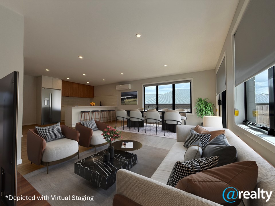 This home, completed in October 2024 features fully insulated walls, floors and ceilings, double glazed windows throughout, large sundrenched lounge and dining, generous kitchen with stone benchtops, tiled walls, plumbed fridge cavity and huge pantry. The bedrooms all feature built-in robes with the master bedroom featuring external access and generous ensuite. A rare feature in a townhouse is the double car garage, with side installed laundry and cabinetry offering plentiful storage and internal access to the home. The rear deck of the home is a fantastic suntrap and perfect for entertaining or bbqs.