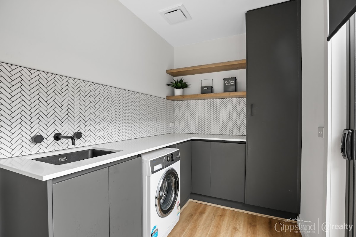 The family bathroom continues the high-end feel, offering a freestanding bath, walk-in shower and double vanity, while the laundry mirrors the home’s premium finishes with matching cabinetry and tiling for a cohesive and considered design.