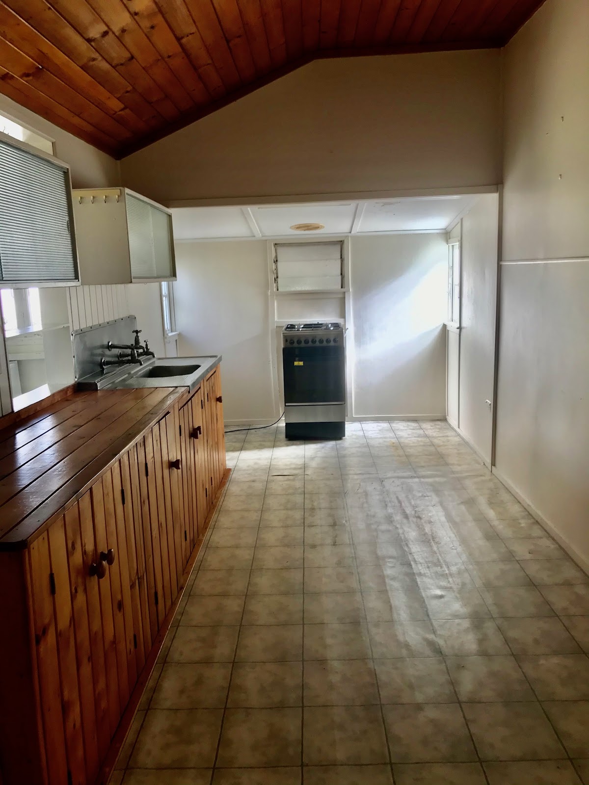 big kitchen with timber cupboards , electric stove