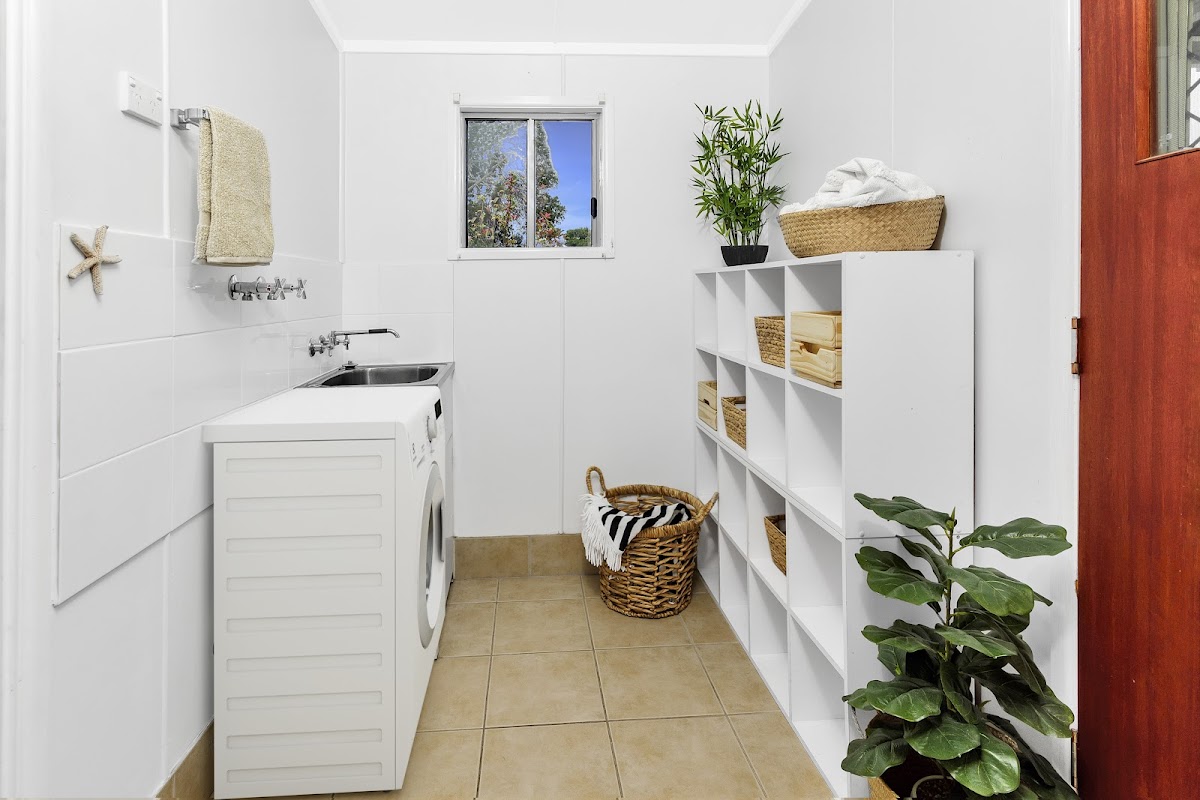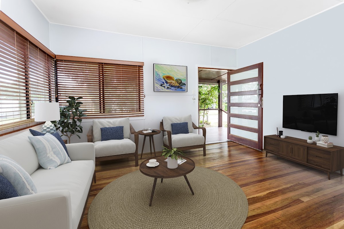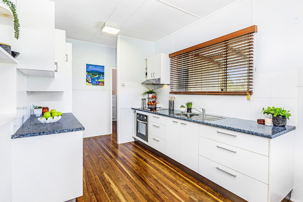 Contemporary features elevate the quaint residence with peace and comfort, including a refurbished white kitchen boasting ample cabinetry, benchtop space, and BlackButt timber floorboards. High ceilings, cedar blinds, and glass louvre windows provide fresh coastal air and natural light to the home’s unique character and homely feel.