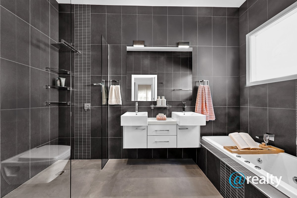 a built-in bath, double vanity, floor-to-ceiling tiles, and a seamless micro cement floor –