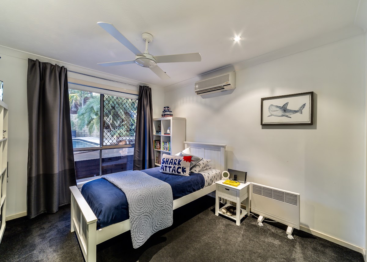 Bedrooms 3 and 4 enjoy pool views, built in robes and air-conditioning.