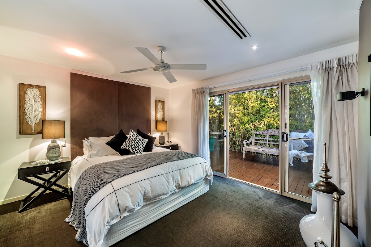 The luxury master suite embraces the privacy of separation from the other bedrooms and features ducted air-conditioning, large en-suite bathroom, a generous walk-thu-robe, and a private tropical deck.