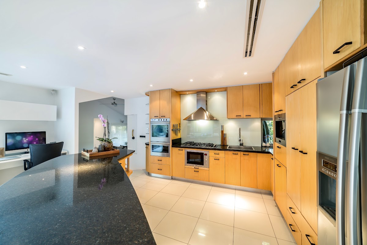 Expansive central kitchen with granite counter tops, quality stainless steel appliances, concealed Miele Dishwasher and in-built coffee machine – overlooking the living room and pool.