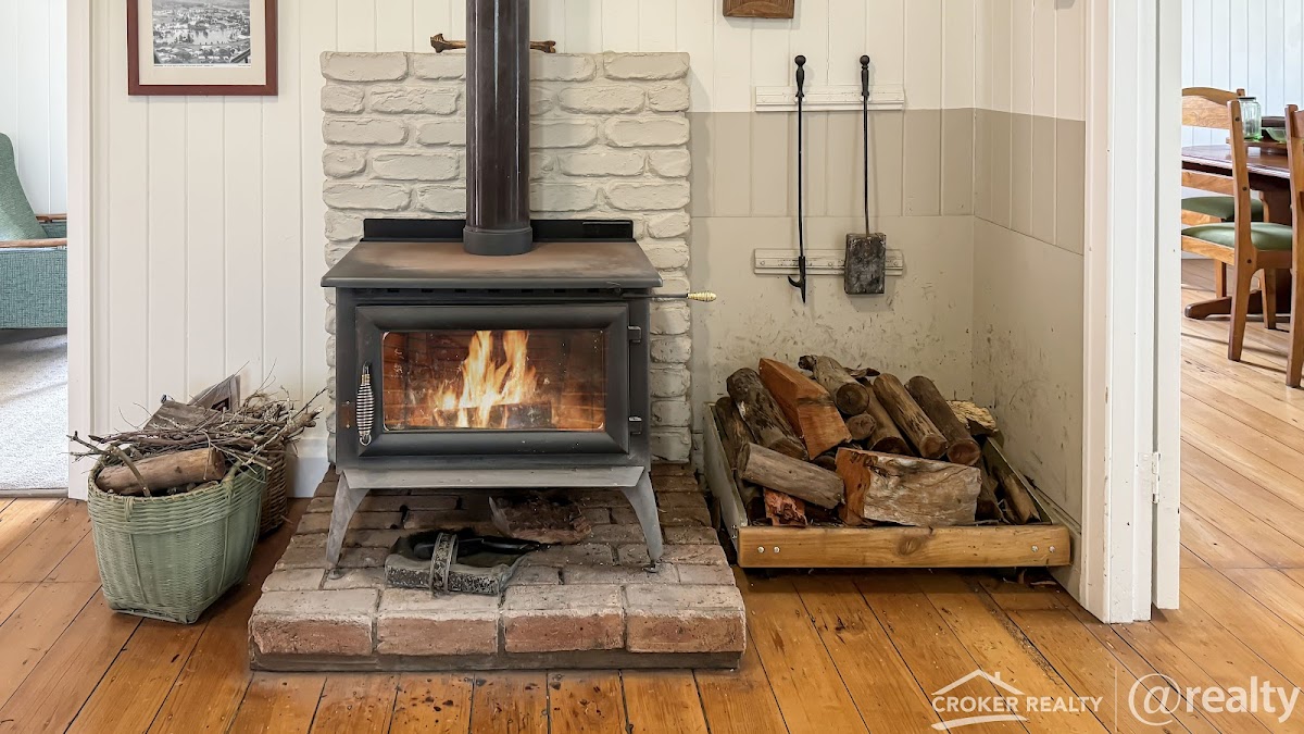 A separate lounge room provides a cozy retreat with a combustion wood heater and air conditioning, while polished hoop pine flooring adds warmth and character throughout the home. The fully renovated shower and toilet area add a modern touch.