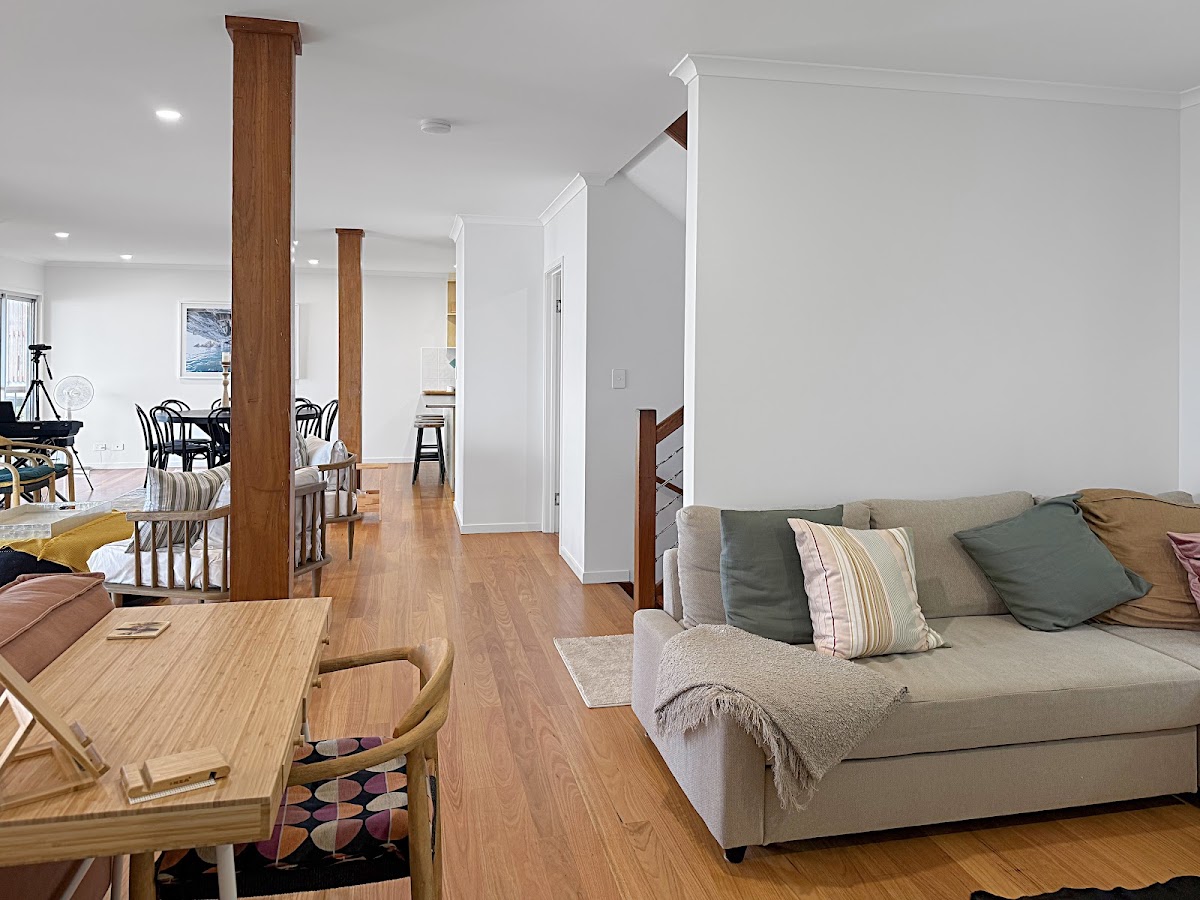 Open-plan living and dining area with polished timber floors