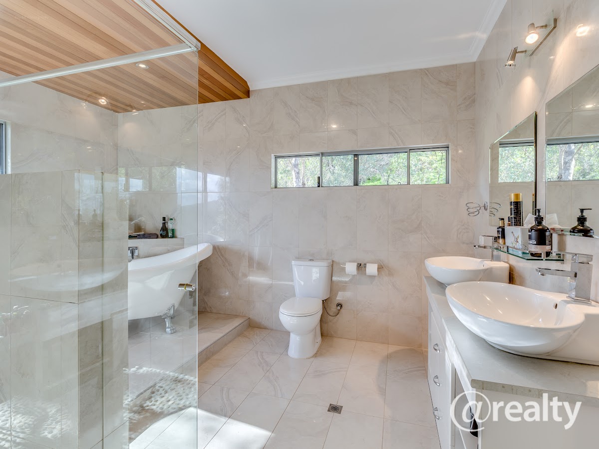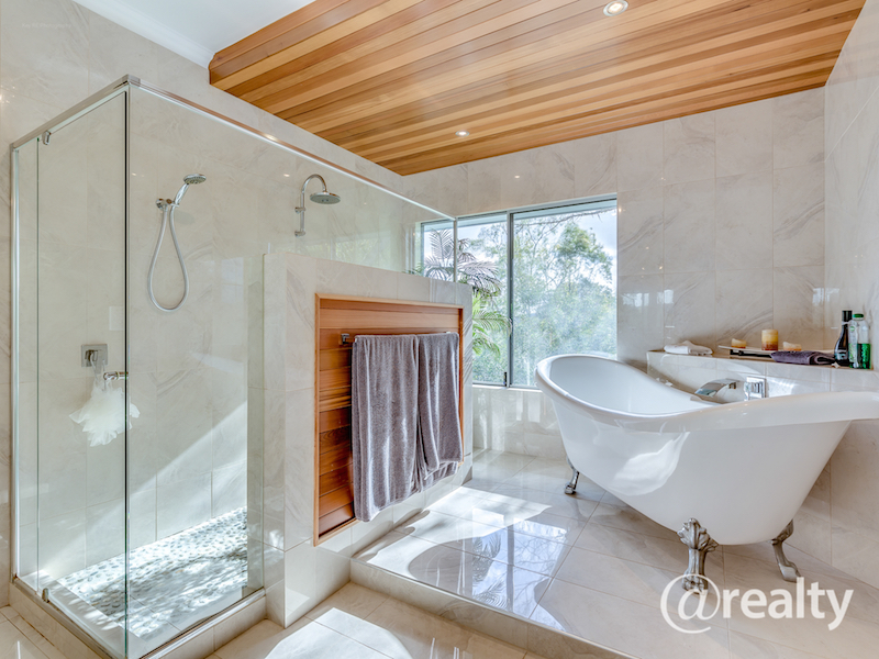 – Ensuite with Claw-footed bath, floor to ceiling tiles and timber ceiling.