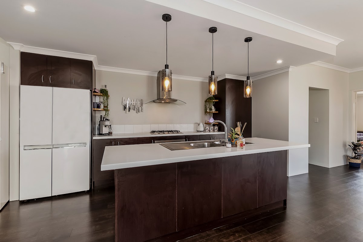 As you proceed to the rear of the property you are welcomed by spacious entertaining areas in an open plan format combining the dining area and kitchen featuring the same wooden flooring, modern freshly painted walls and ceiling and more than enough room to entertain even the biggest of families. The spacious kitchen area will have you dreaming of the good nights to be had, it comes complete with spacious stone bench tops, modern downlights, endless storage, pantry, gas oven/stove, tiled splash-back, and an extra large fridge space.