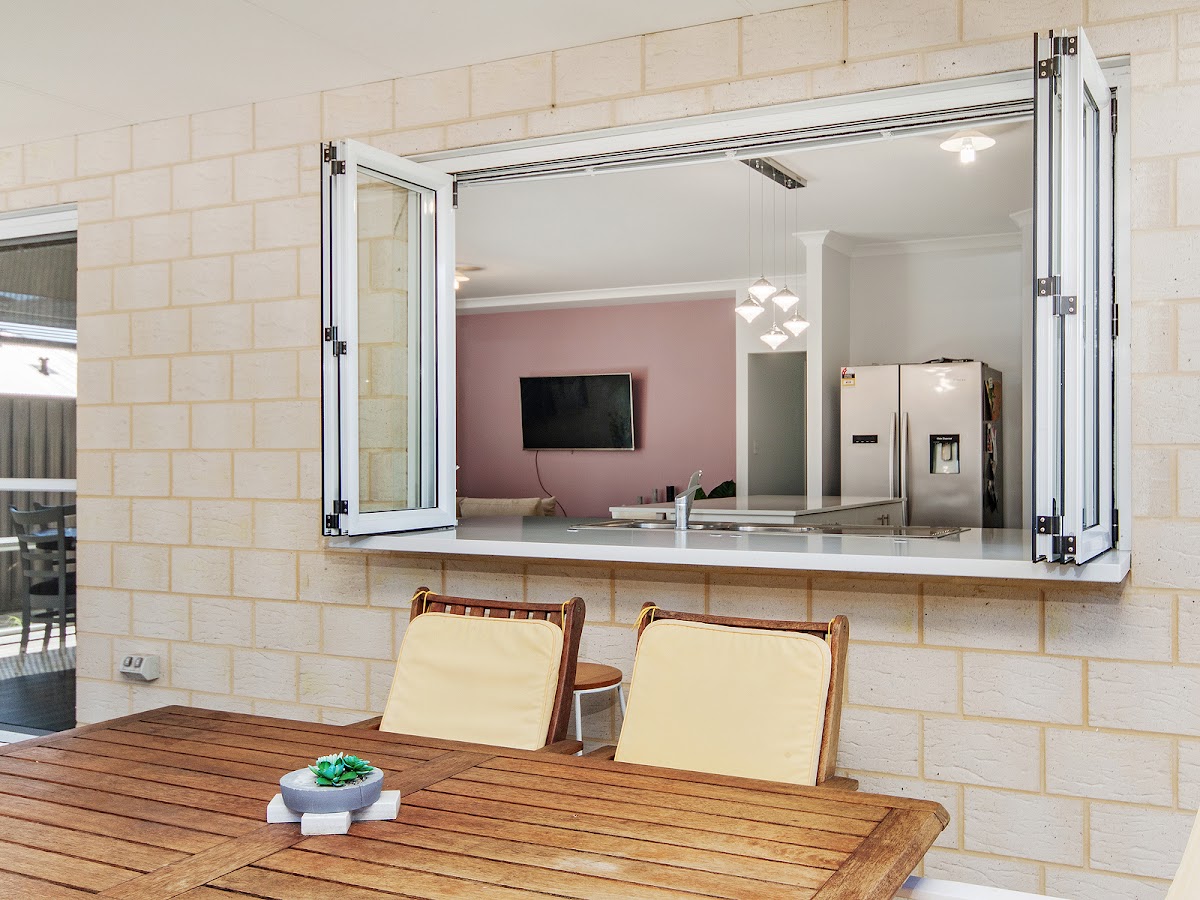 *Stunning kitchen with stone bench tops, heaps of storage and bi-fold servery windows