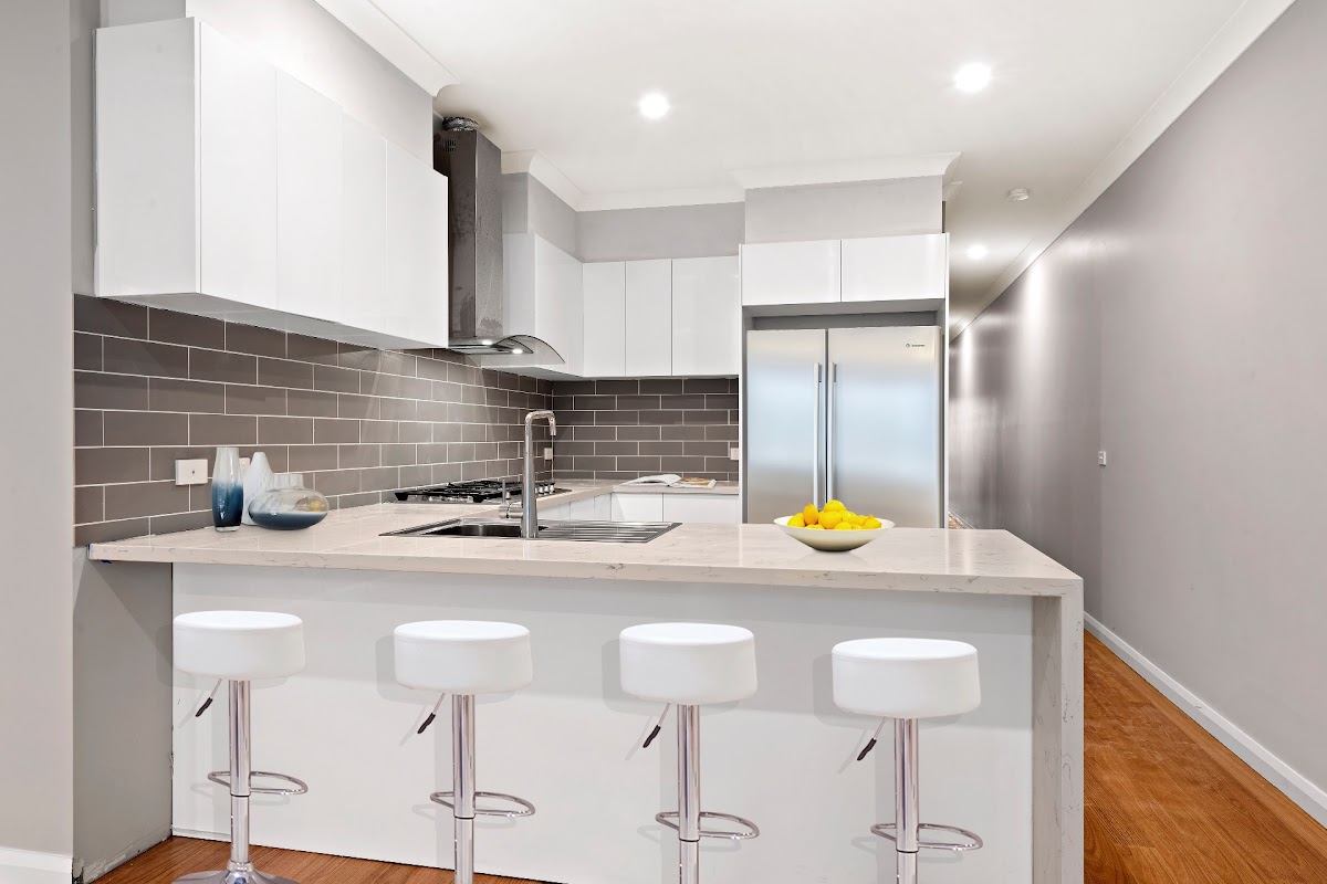 dishwasher, soft close drawers and subway tiled splashback. The open plan design