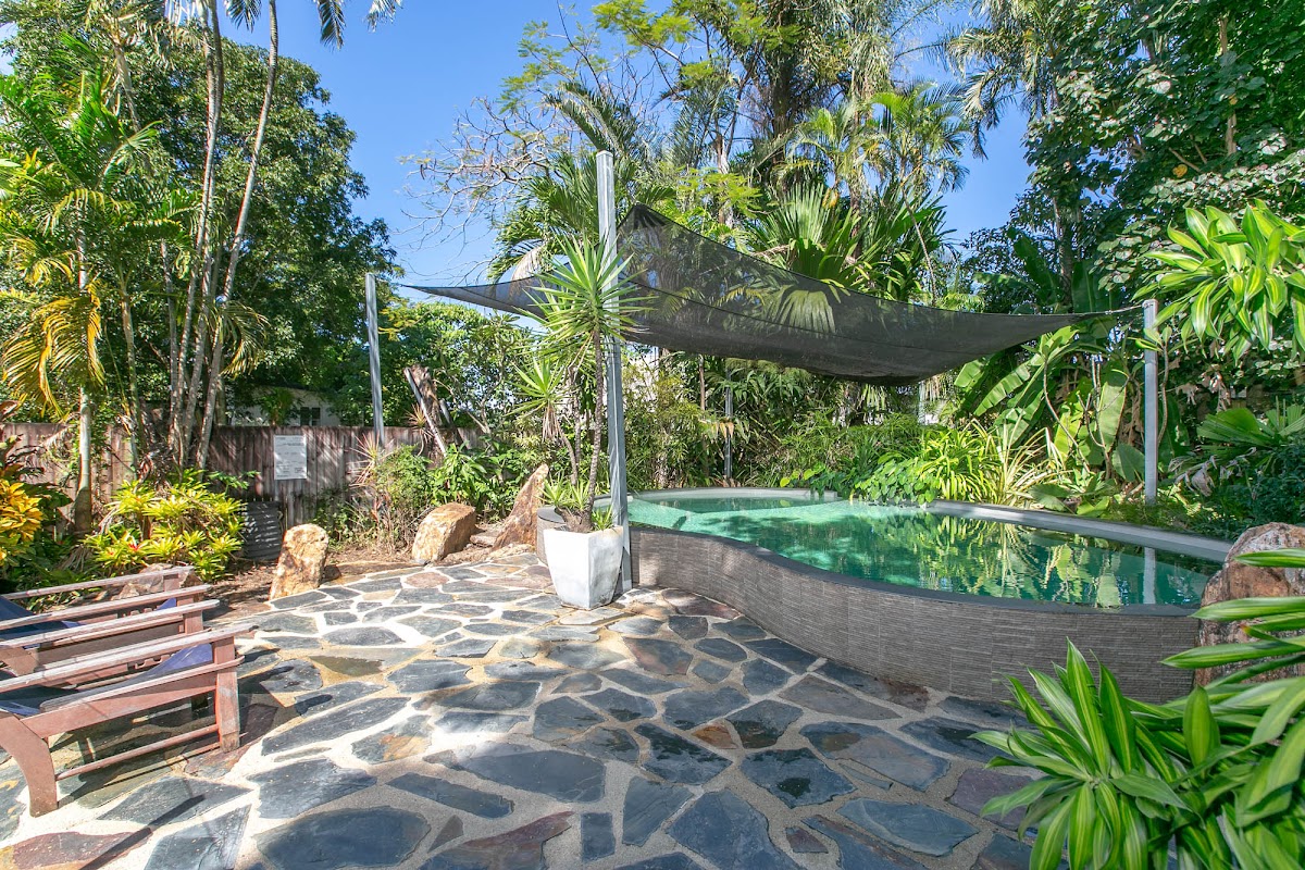 Positioned on a peaceful street, a relaxed floorplan and lush outdoor space come together to create warm family residence near the heart of the city. Timber floors flow into an open plan living area, incorporating a kitchen equipped with stainless steel 90cm gas stove/oven, leading out to the deck with outdoor dining space shaded by established trees. A natural freshwater inground swimming pool surrounded by tropical plants make this the ultimate health experience (can be converted to salt/chlorine). Offering two sun filled bedrooms, bathroom, laundry, ample storage, in-ground water tank, full garden irrigation system, side access and parking for one car completes the residence.