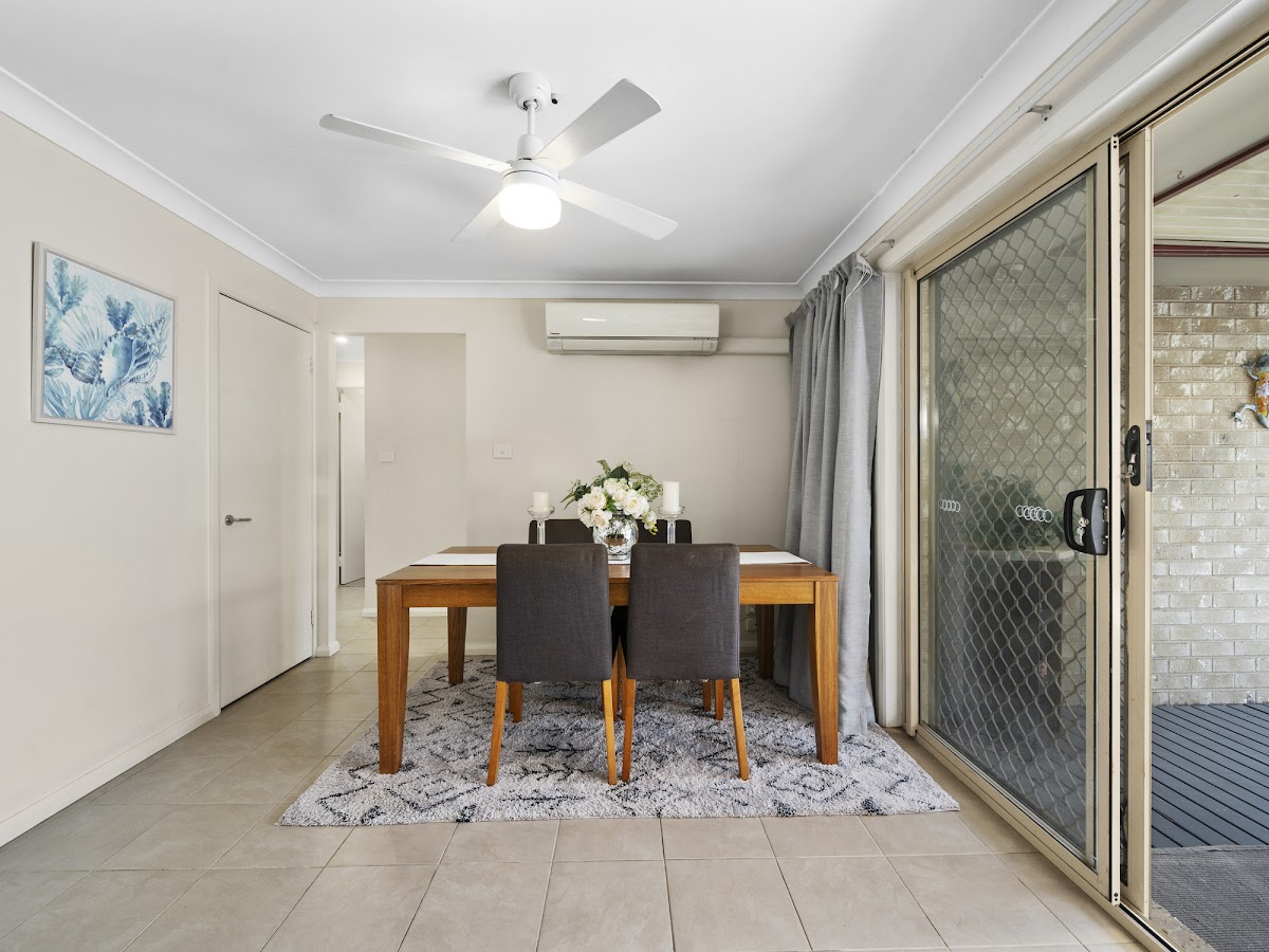 Air conditioning and ceiling fans provide all year comfort.Go through the sliding door to relax on the large veranda at the rear of the property and enjoy the cooling summer breezes or entertain friends and family in the undercover alfresco dining space.