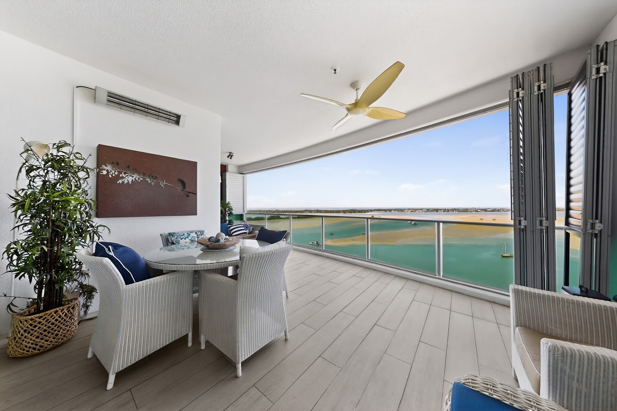 Escape to your own slice of coastal paradise in this spectacular 2-bedroom, study and 2-bathroom apartment perched high on level 13 of the prestigious Marine Parade building, AQUA. With sweeping broadwater and city aspect views and an impressive 168 square metres of luxurious living space, this Labrador gem offers the perfect blend of sophisticated urban living and broadwater tranquillity.