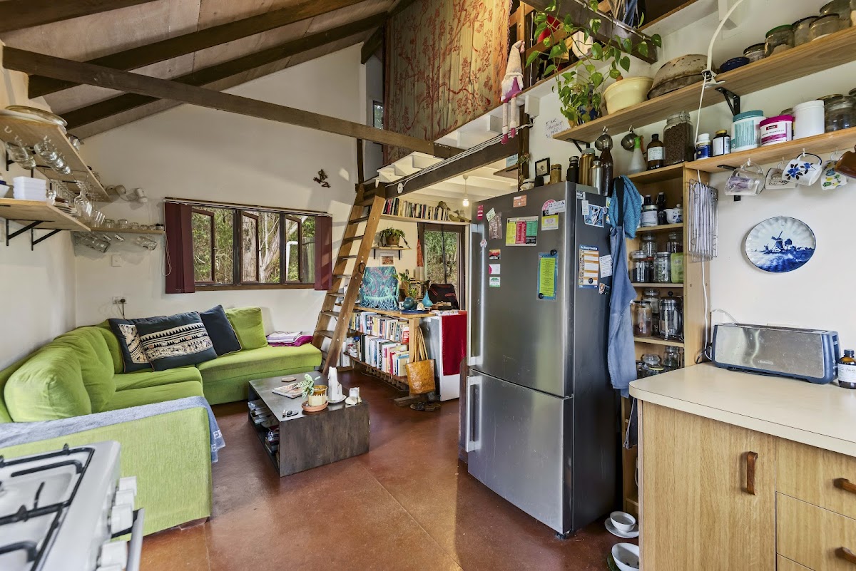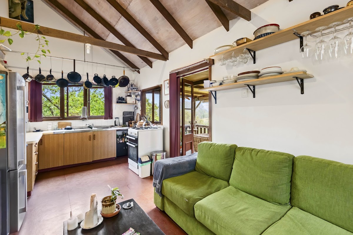 A large mulberry tree assists visual privacy between the main house and the studio. The studio is very cute and cosy. It features open plan living, a downstairs bedroom, a loft upstairs, office area, wood heater & a gorgeous view from the deck over the veggie garden across the valley. It is currently rented for $300 p/w on a month to month basis.