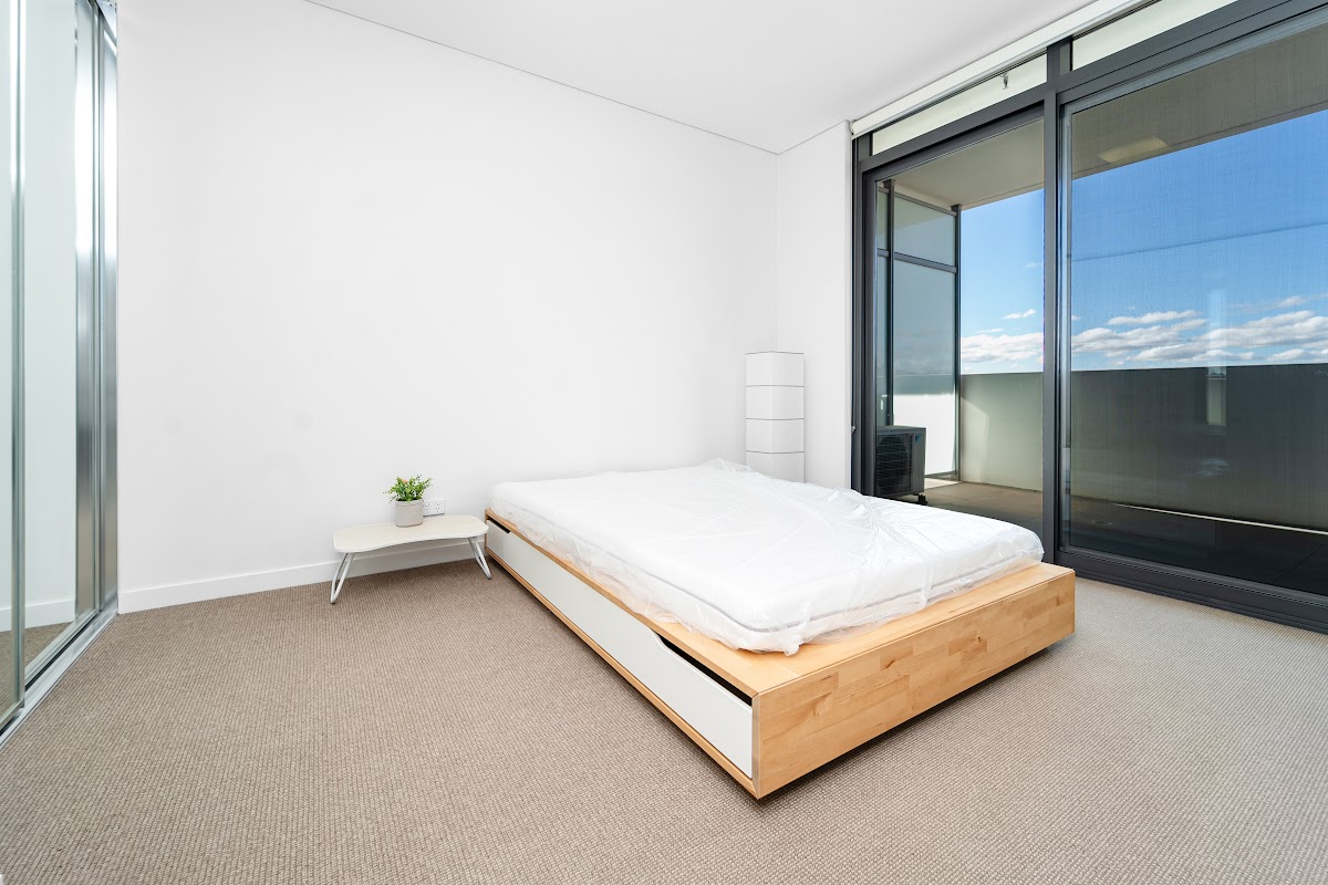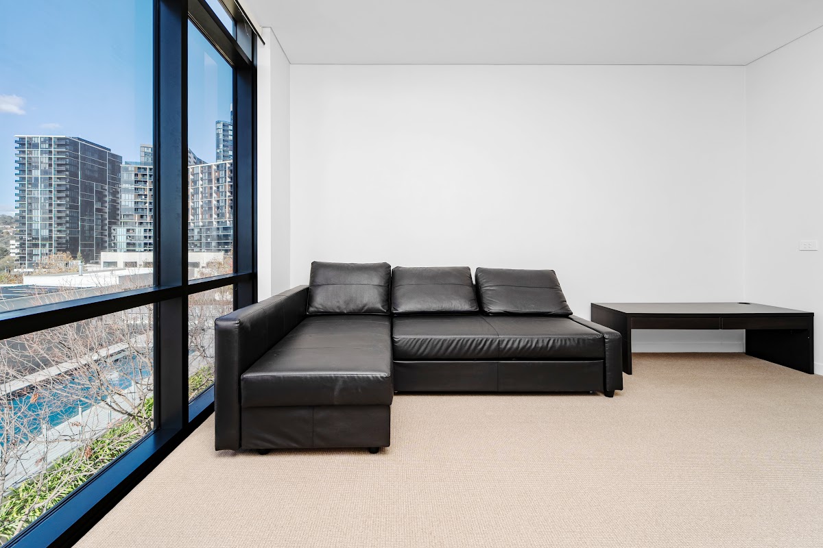 The open-plan living area is flooded with natural light from floor-to-ceiling windows, showcasing stunning views over Belconnen and toward the lake. The spacious master bedroom features built-in robes and opens to a charming balcony, providing a serene outdoor space for tenants to relax and enjoy fresh air.