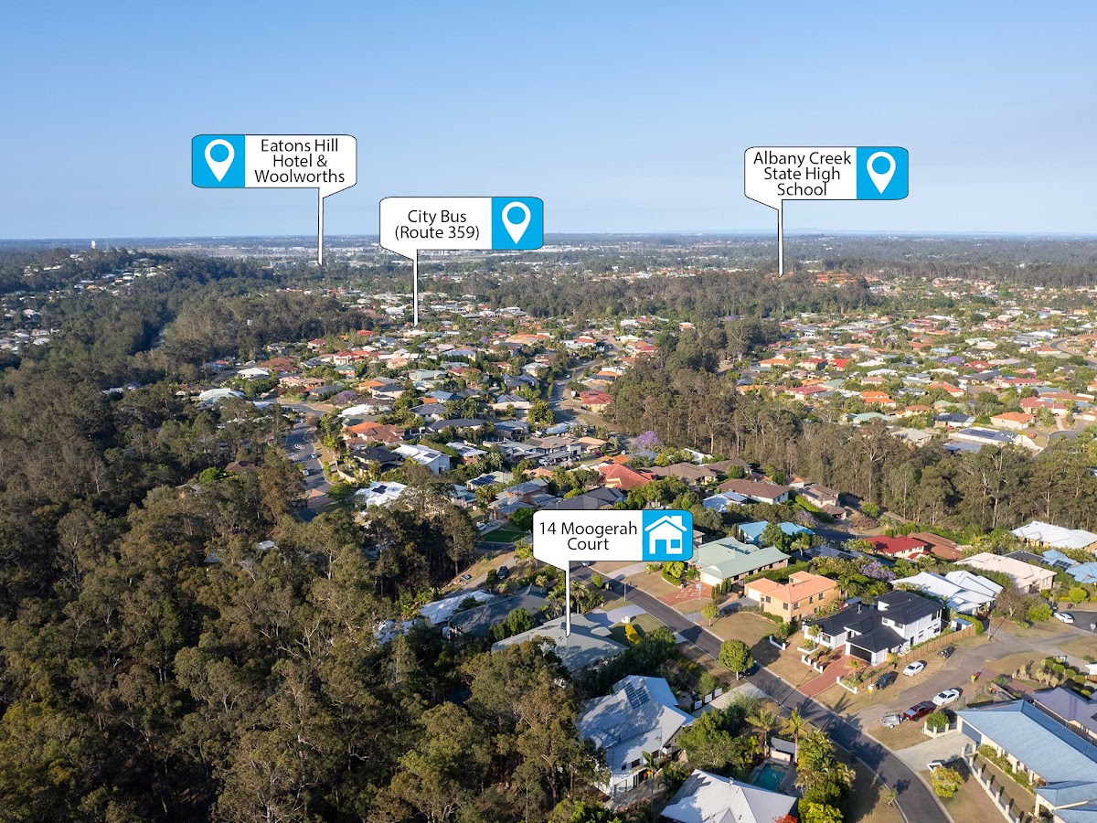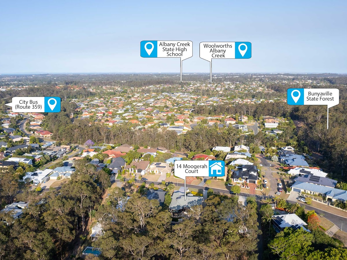 This location is regarded as Albany Creek’s finest. Away from the hustle, yet convenient for families, it’s a 900m walk to Brisbane city buses (routes 359) and just 2.5km to the Albany Creek Coles or Woolworths shopping centres. It’s an easy commute to quality nearby schools within catchment, including Albany Creek State School (3.3km) and Albany Creek State High School (2.9km). Then explore local nature at your doorstep, merely 100 metres to the start of walking paths and cycle tracks that wind through the Bunyaville State Forest.