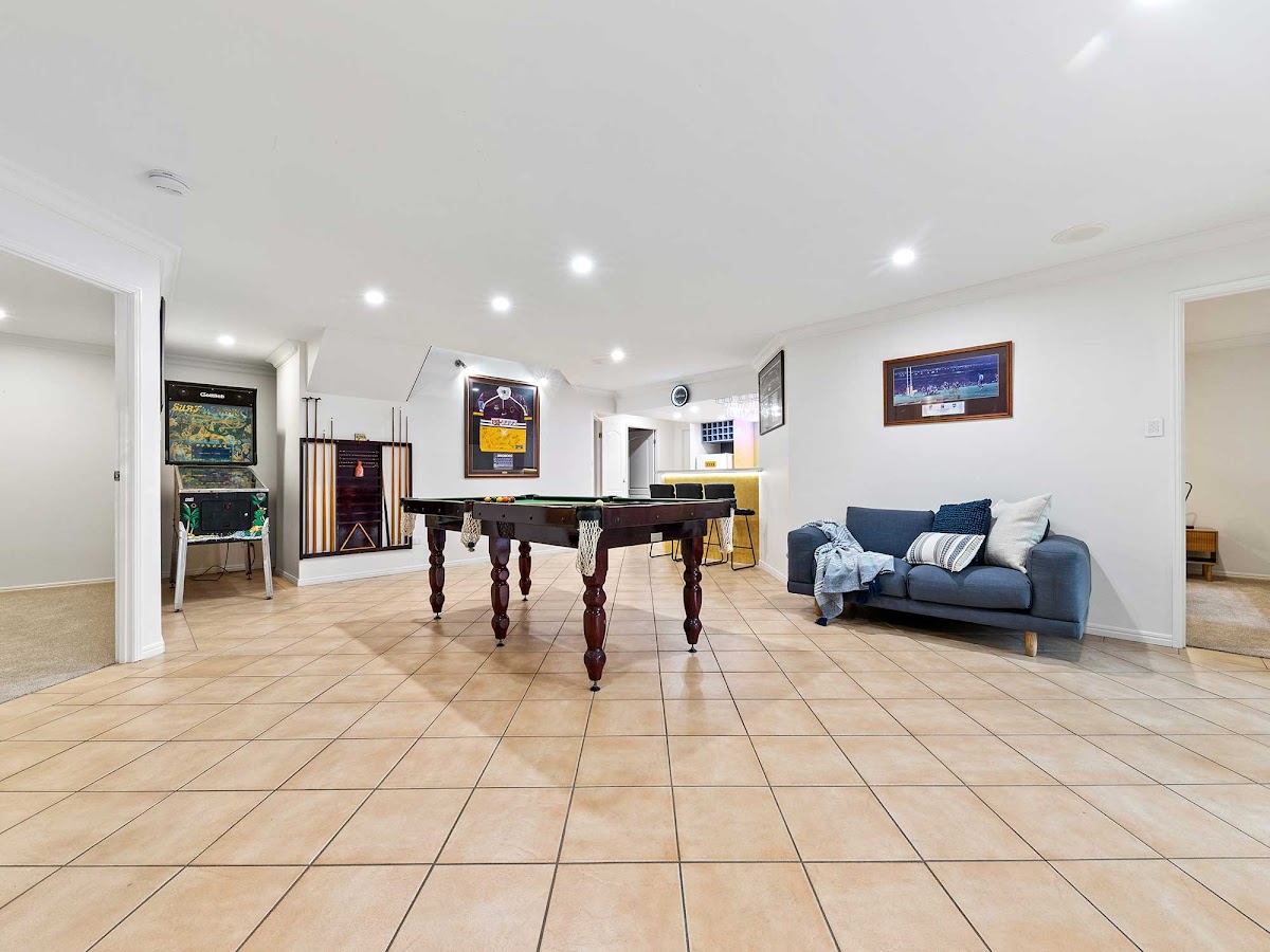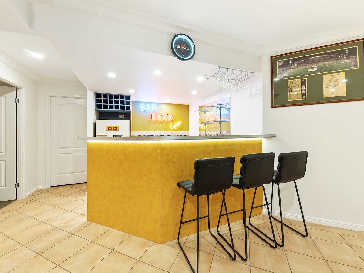 Take the timber staircase, with modern glass and aluminium balustrading, to the very versatile lower level. This level could be ideal for a granny flat, for teens or an extended family to spread out in their own space, with two large built-in bedrooms and a bathroom. This level could also be configured into a large home business space. The living areas here include a private media room, a tiled alfresco area overlooking the pool, and a huge rumpus room where family and friends can enjoy a game of pool or take a seat at the very cool bar. There’s a triple garage space, or 15-metre-long storeroom, perfect for a home business, tradespeople who need to store materials, or those with extra vehicles, camper trailer, jet-ski, tinnie etc.