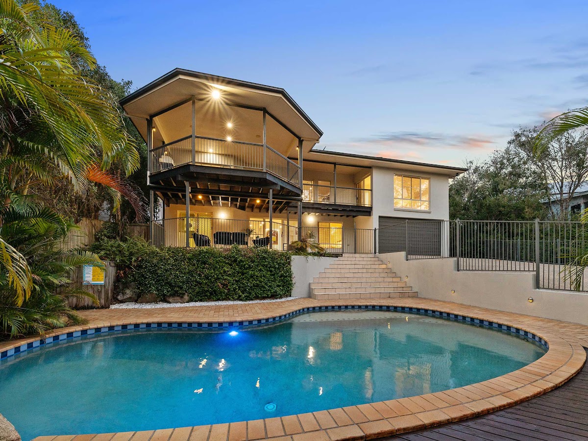 The stylish gourmet kitchen looks over the living areas and out over the entertaining deck (through the servery window) to the magical views. The gleaming black granite benchtops and breakfast bar contrast classically against gloss white cabinetry, offering ample meal preparation and storage space. An abundance of cupboard, drawer, pantry and appliance space make this kitchen perfect for the largest family. If you prefer to relax with family and friends over a BBQ, then the enormous entertaining deck is the ideal setting. From here you can watch the kids swim in the sparkling pool below, spot koalas and birdlife in the surrounding trees, or enjoy the spectacular sunsets over the mountains.