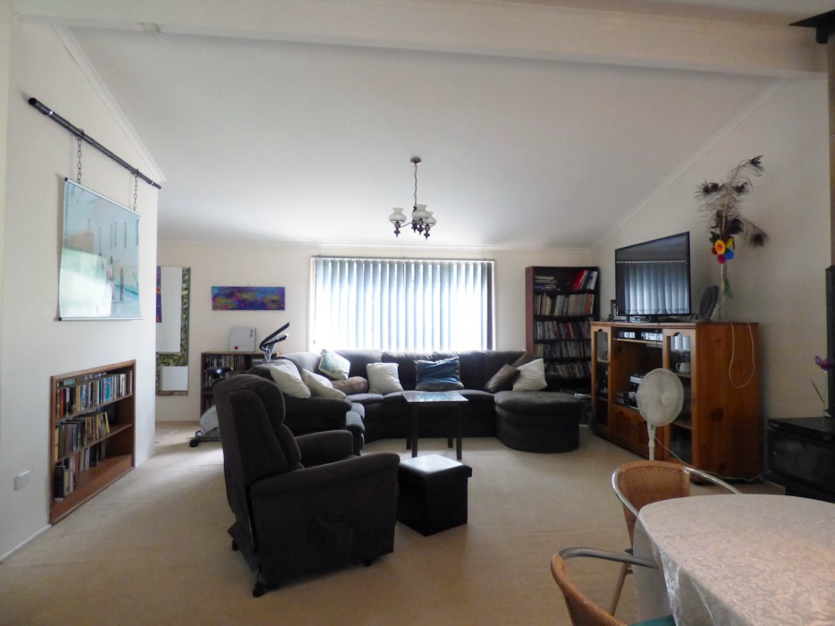 Large open plan dining and living with high cathedral ceilings area has reverse cycle split system and wood heater.