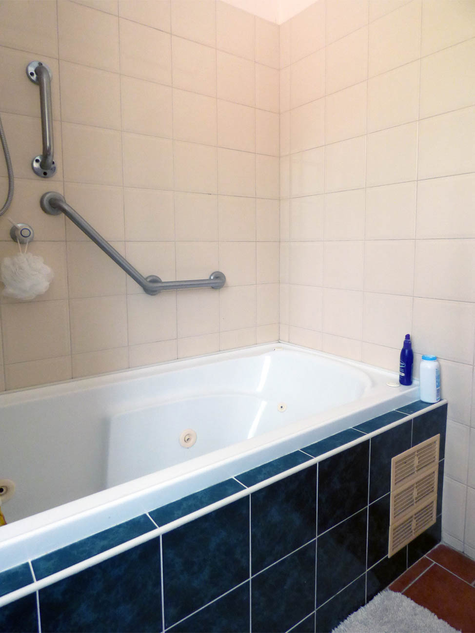 Two way bathroom with a large spa bath, combined shower plus toilet.