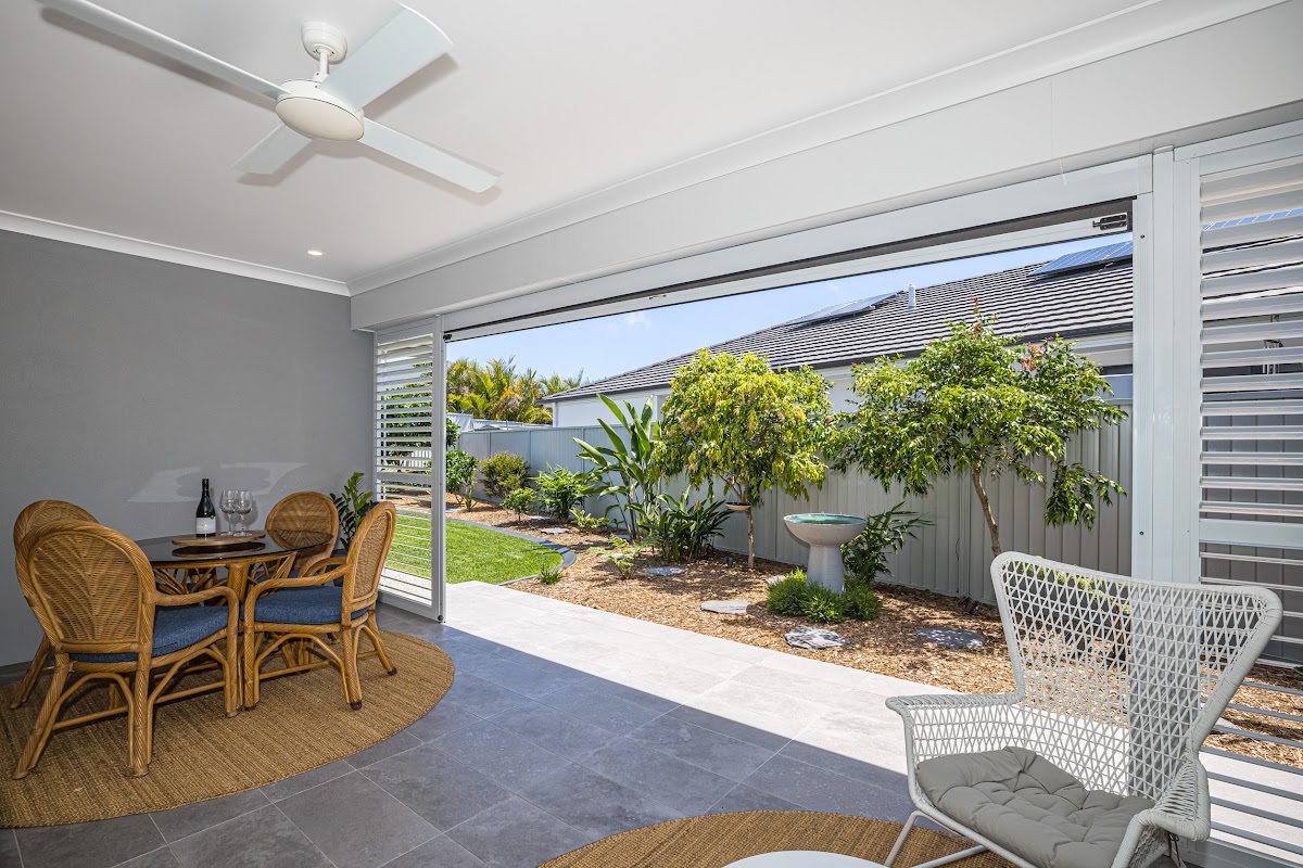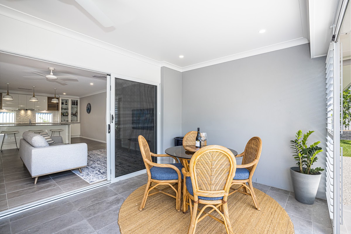 The large open plan living area flows to a generous covered outdoor entertainment space (equipped with quality blinds and louvres). Beyond this lie the serene gardens and water feature, creating a tranquil outdoor haven.