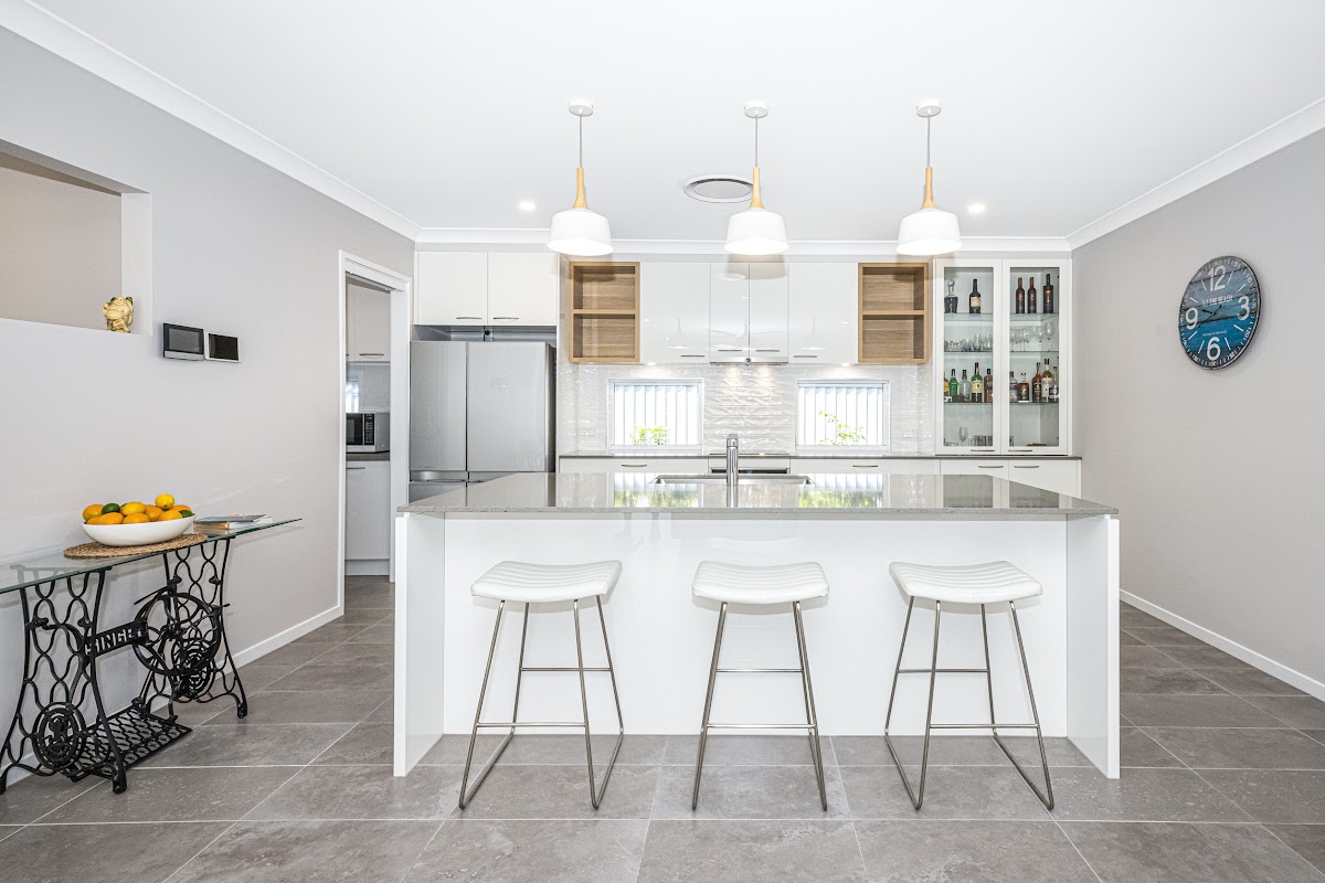 The home has three bedrooms, two bathrooms, and a spacious open plan kitchen with Caesar stone bench tops, butler’s pantry, soft close drawers and cupboards, filtered water, top of the range NEFF cook top, self cleaning oven and dishwasher.