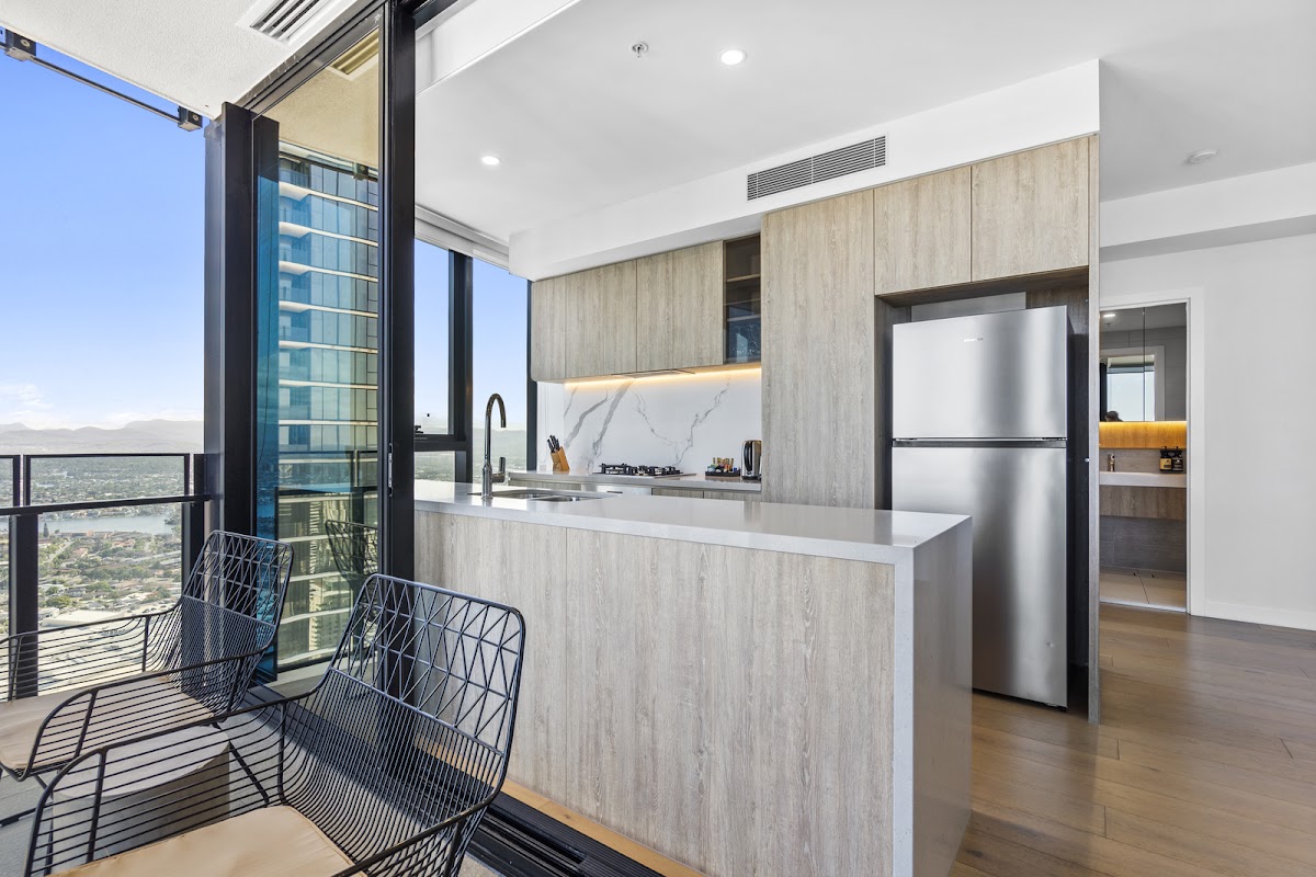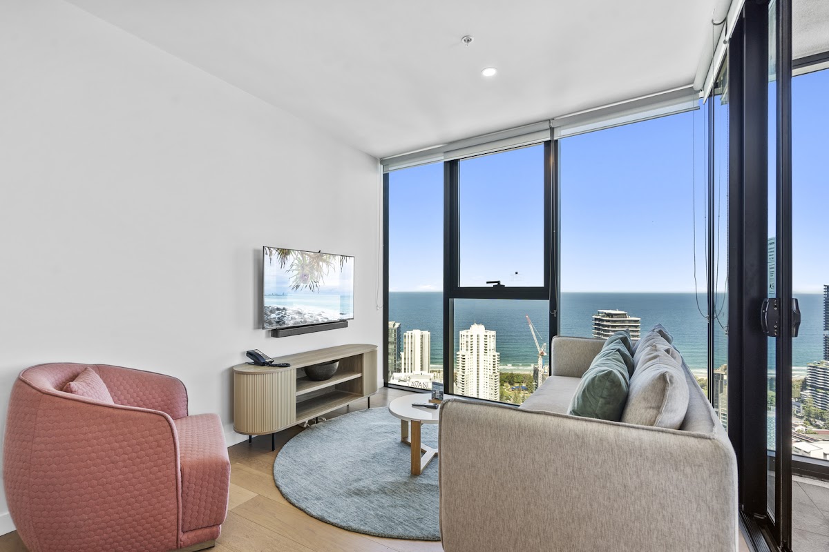 Beautifully designed with a bright coastal-inspired palette, the apartment features premium finishes, seamless indoor–outdoor living, and stunning Hinterland views from Level 46.