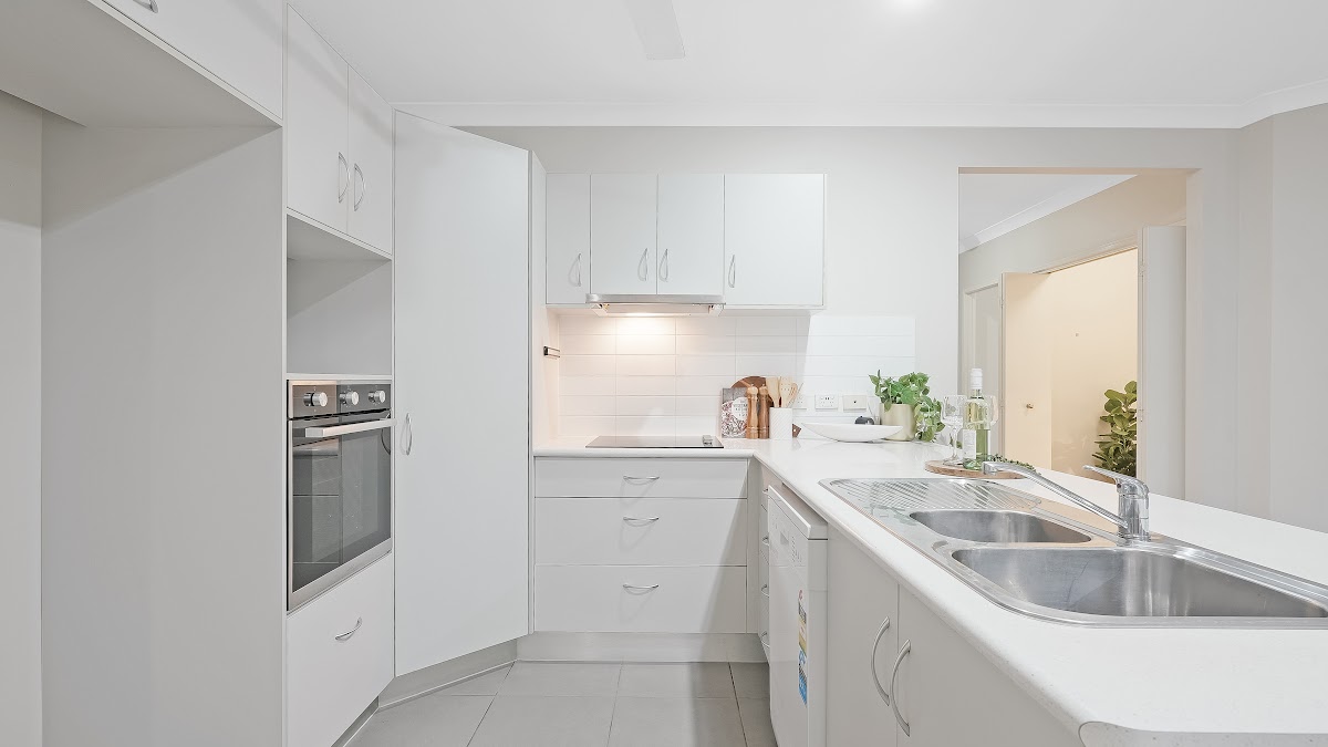 – Central open plan kitchen with a corner pantry, large fridge void and multiple drawers with ample storage space, plus a peninsula bench providing a convenient place for a quick snack or your morning coffee.