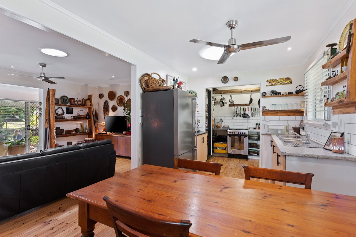 * Open plan living and dining room with recently polished cypress pine timber floors.