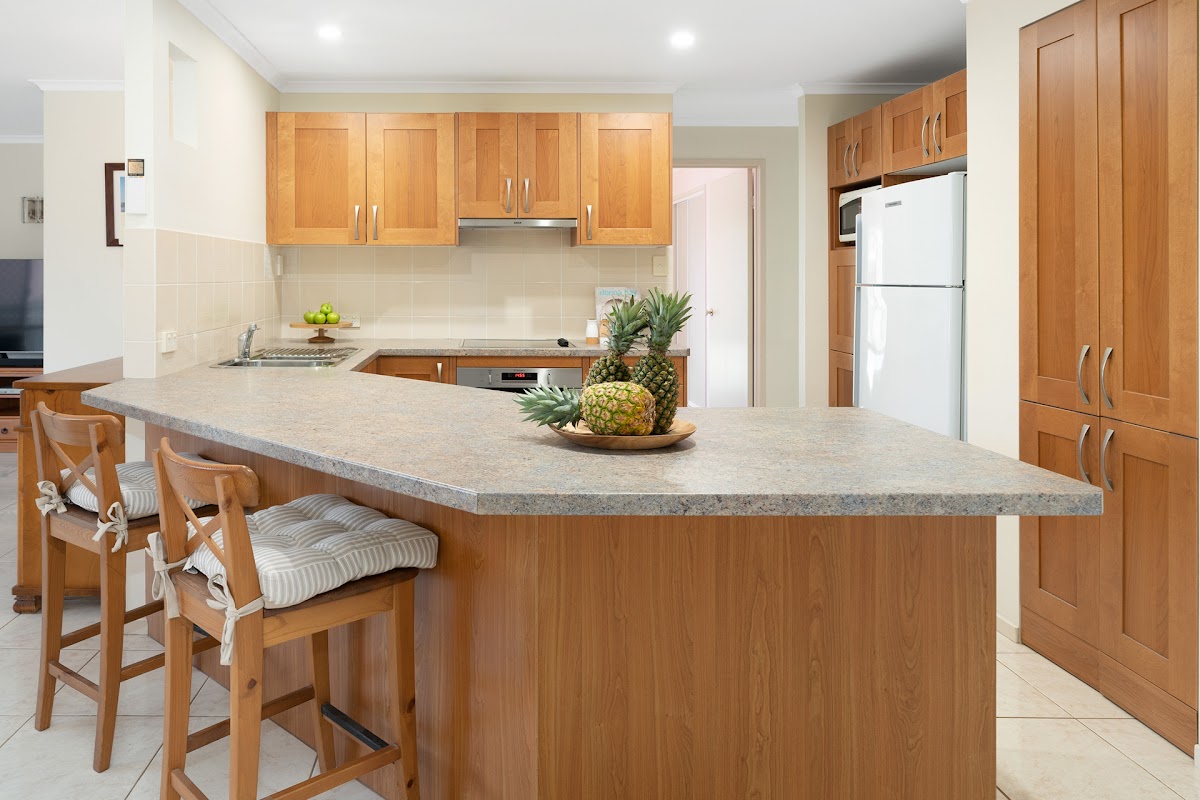 Centrally located kitchen is open plan and overlooks the living and dining areas both inside and out.
