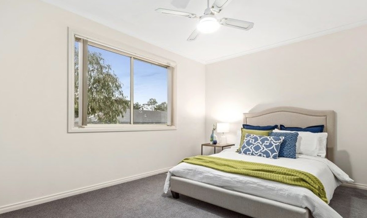 Flooded with natural light, this space has plenty of room for the couches, coffee table and dining suite, plus ceiling fans and split-system air-conditioning for comfort.