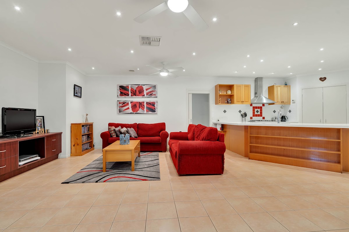 Moving further into the main living area of the home you are presented with the kitchen, which is centrally located and overlooks the family meals area and yet another living area with couches/TV/coffee table. Are you keeping up with how many living areas? That’s 3 so far…The kitchen is extremely high quality and features stainless steal appliances, stone bench tops, enough room for a double fridge, large pantry and ample storage options. All of this opens out into the alfresco area through two large bifold doors. The alfresco area is undercover and semi enclosed which offers full privacy from the neighbours and is paved with high end outdoor tiles. There is also a rear garage door for easy access. The garage is oversized and designed to accomodate two large four wheel drives. So there is plenty of room. The backyard of the property is landscaped and low maintenance in its design.