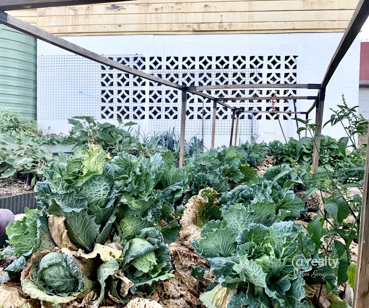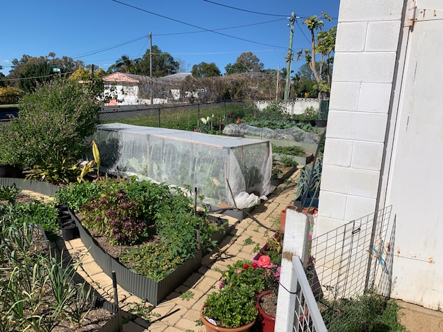 Vegetable garden beds outside, with still space for the children to run around.