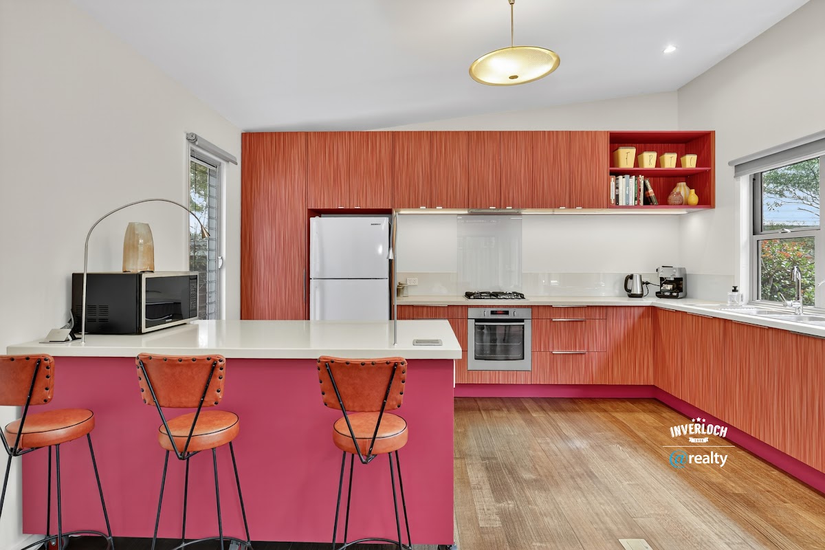 Walk in and your eyes go straight to the kitchen. Not because it’s huge or flashy, but because someone made the brilliant decision to paint the cabinets bright pink. It’s bold, it’s fun, and somehow it just works in this light-filled coastal space. The mobile island bench can roll wherever you need it — out to the deck for summer barbecues, over by the dining table when you’re hosting, back to the kitchen for everyday cooking. It’s got built-in power points and lighting, so it’s actually useful, not just a good idea.
