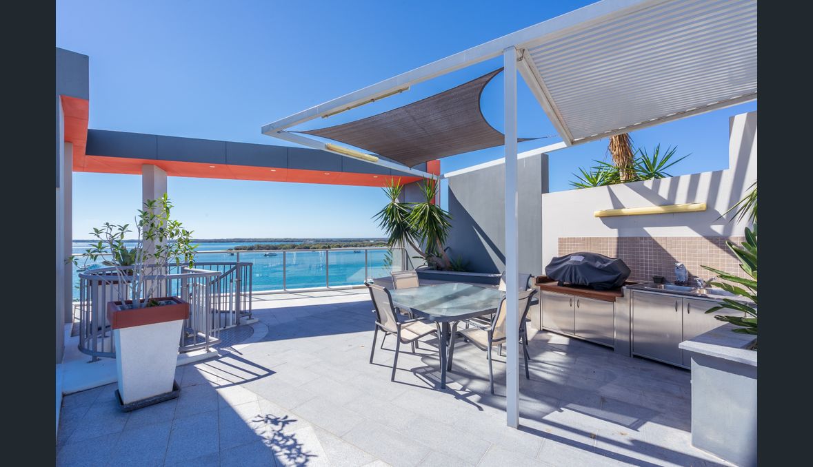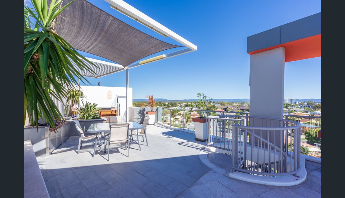 Being a corner unit, the apartment has superior deck size and a stunning rooftop garden area where you can sit in the spa well enjoying some of the best views on the Gold Coast with views to Paradise point and beyond.