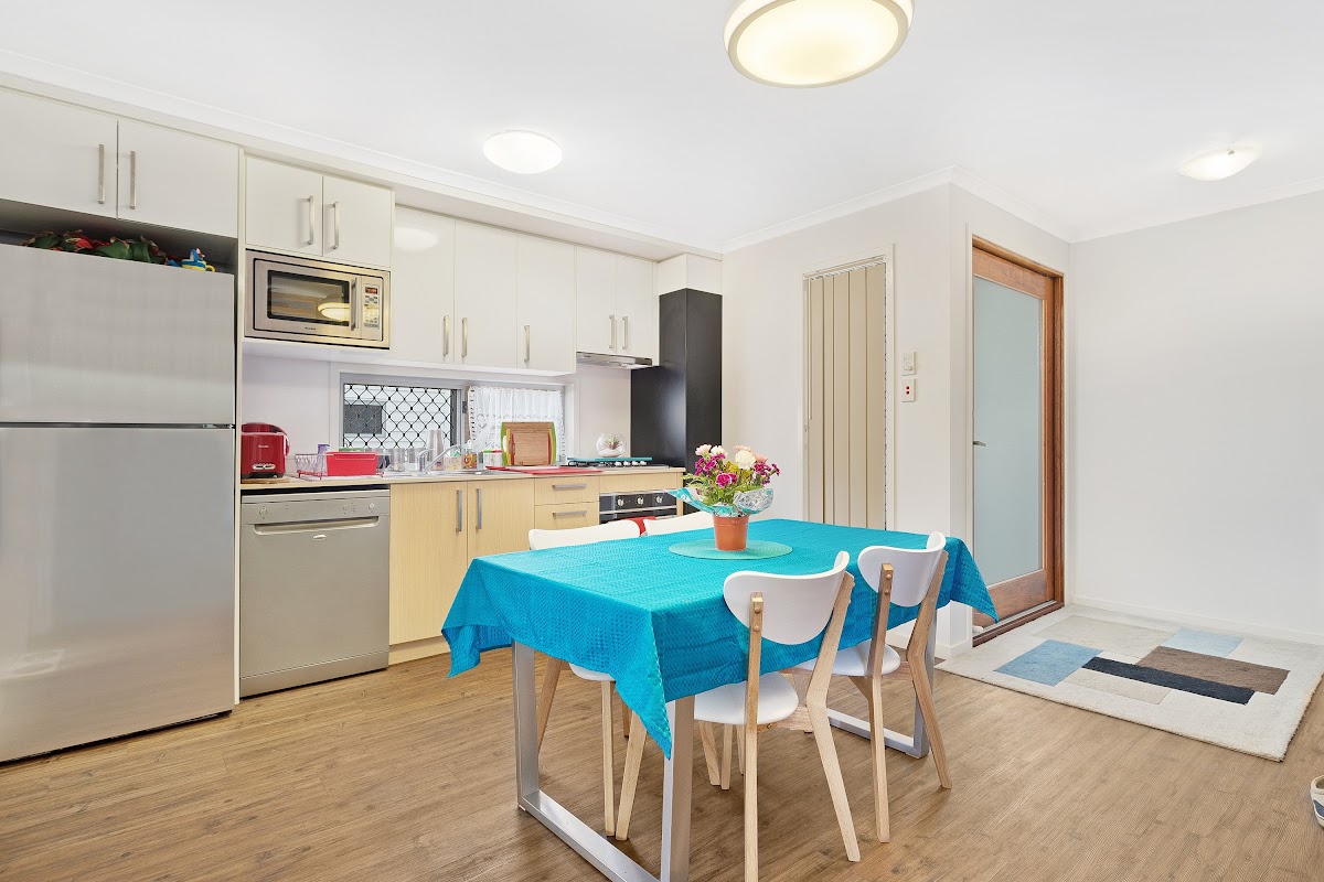 This townhouse has been built to 14,000 environmental standard with reduced carbon emissions and environmental disturbance and designed to take in it’s environment, with outdoor spaces transitioning easily with the indoors. The elevated position and high ceilings allow for cooling breezes to reduce costs. with no external timber, your maintenance costs are reduced. Kitchen includes stone benchtops with stainless appliances including gas cooktop, electric oven and dishwasher.